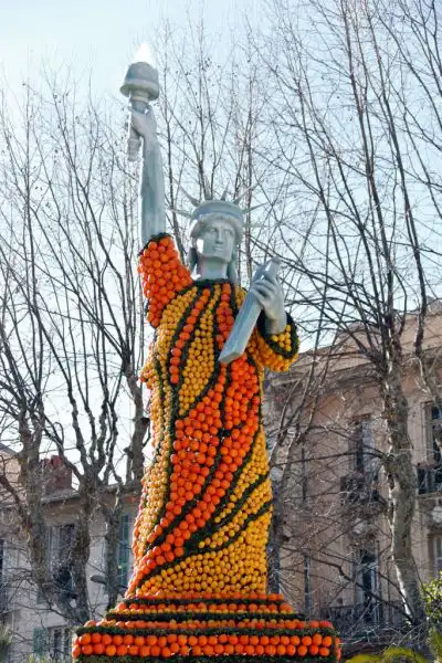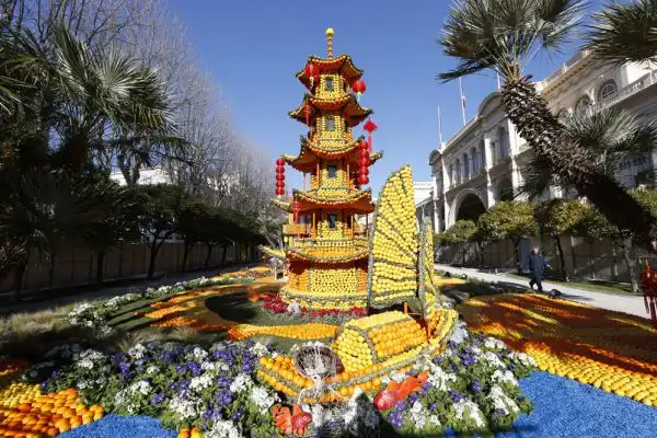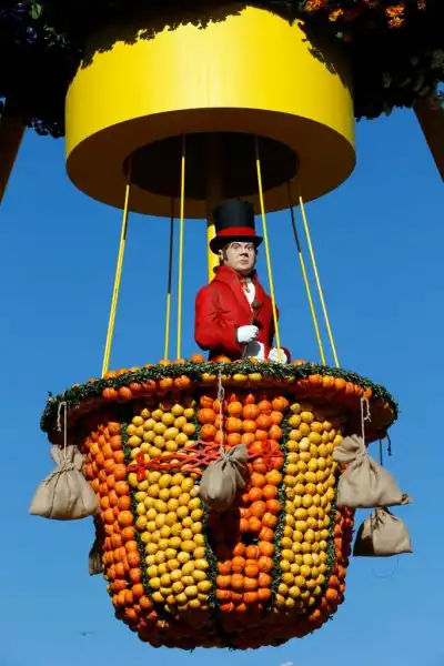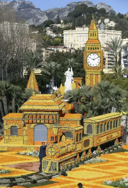 На набережной Променад-дю-Солей проходит парад колесниц, декорированных лимонами, апельсинами и грейпфрутами.