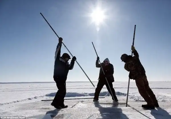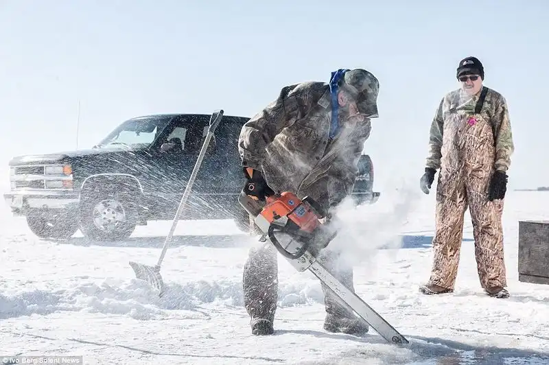 Рыбаки, в попытке поймать осетра, рискуют жизнями двигаясь по замершему озеру Виннебаго (Winnebago).