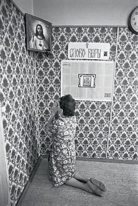 Женщина молится на иконку. Отделение для ВИЧ инфицированных. Москва 1993 год.