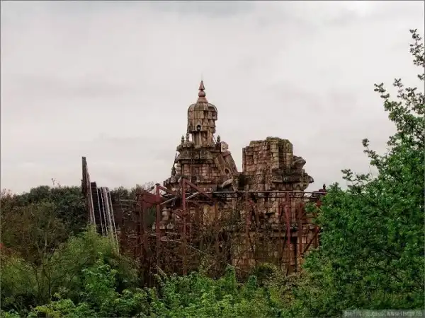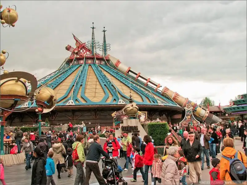 Дальше мы сходили пообедать и разделились, девчонки пошли закупиться сувенирами, а я с другом отправился на «Space Mountain Mission 2″ — совершенно безумный аттракцион, он и является самым популярный в парижском Диснейленде. Это был первый аттракцион на котором мы прокатились, он же и был последним. Суть проста, вас сажают в тележку, ставят тележку под углом в 32 градуса и катапультируют в пространство с ускорением примерно 14 метров в секунду, все это происходит с безумными звуковыми и дымовыми спецэффектами. В момент старта человек испытывает перегрузку до 1.5G в течении пары секунд, далее в полной темноте с редкими вспышками вас болтает туда-сюда на огромной скорости по всех возможных направлениях, довольно быстро мы выяснили что круче всего болтает на последних местах, зато на первых страшнее всего, но туда и попасть проблематично. Вот так вот выглядит здание аттракциона, собственно по жерло пушки и есть стартовая прямая, в конце которой вы резко уходите вниз.