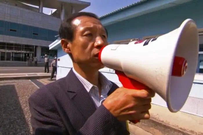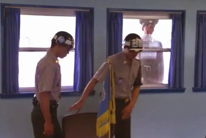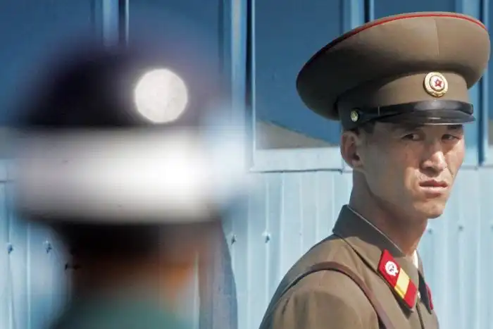 3 северокорейских солдата напротив. Ходят слухи, что если один попытается убежать к южанам