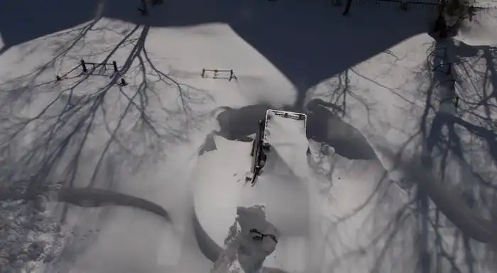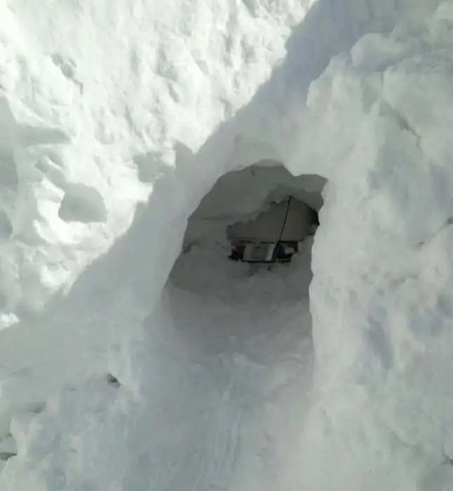под огромными снежными сугробами.