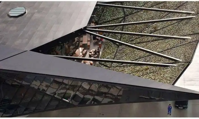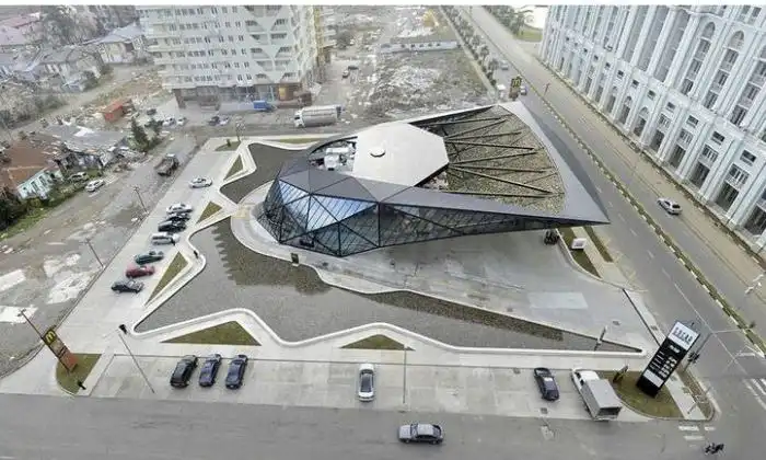 Здание построено недавно в своеобразном футуристическом стиле.