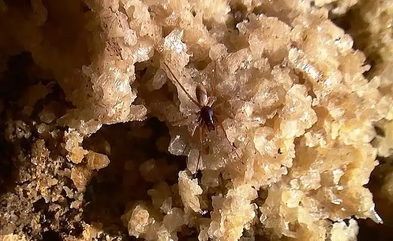 Cлепой паук Agraecina cristiani наощупь патрулирует надводную часть грота в поисках коллембол и мокриц. Обитатели пещеры слепы и ориентируются на ощупь и по запаху (точнее, по химическому чувству – у беспозвоночных обоняние зачастую неотделимо от вкуса), а также улавливая малейшие вибрации камня, воздуха или воды.