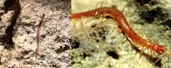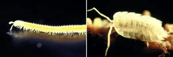 Слева: многоножка Arheboreoiulus зр. ползет в темноте в поисках пищи. Справа: сухопутная мокрица Armadillidium tabacarui.