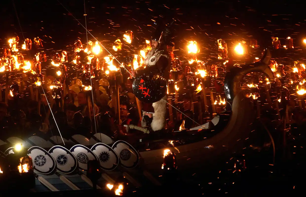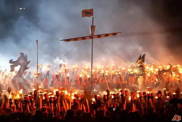 Праздник зимнего солнцеворота - викинги с факелами в руках катят корабль через город (его сожгут на берегу).