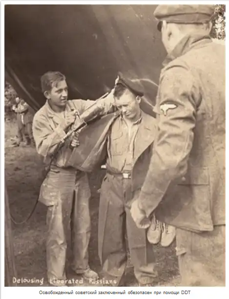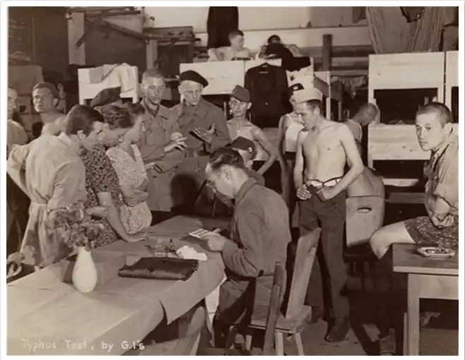 К июлю 1945 года, эпидемия тифа в концентрационном лагере Дахау, была взята под контроль врачами армии США, и все заключенные были либо освобождены, либо перемещены в лагерь для перемещенных лиц в Ландсберг. На фотографии видно как бывшие заключенные проходят проверку на тиф, прежде чем получить разрешение покинуть лагерь.
