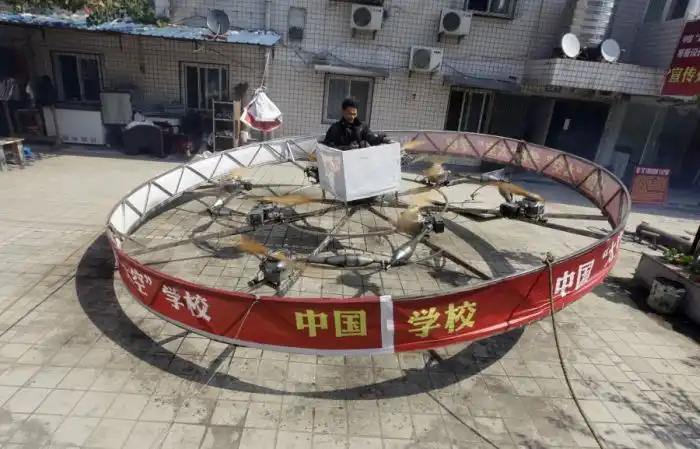Фермер Шу Мэншенг парит над землей в своем дворе на летательном аппарате,