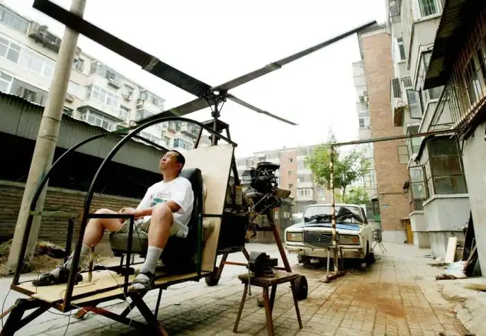55-летний кузнец, Тиан Шенгиинг регулирует ротор своего самодельного вертолета