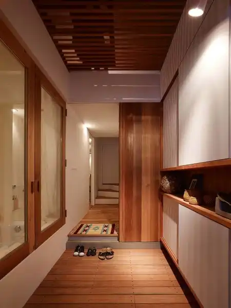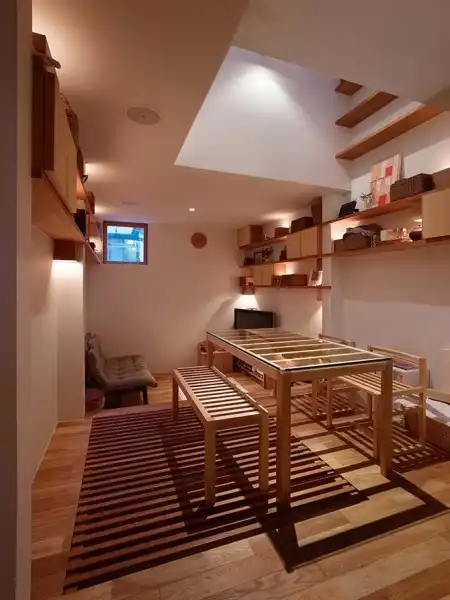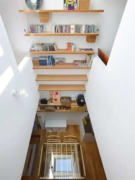Архитекторы умело использовали небольшой земельный участок на одной из центральных улиц, подарив жильцам укромный очаг спокойствия и надежности. Главной архитектурной особенностью проекта является, как ни странно, пустота, проходящая по центру резиденции. Нависающая над столовой, она сосредоточивает вокруг себя гостиную, кухню, детскую комнату и спальню родителей.