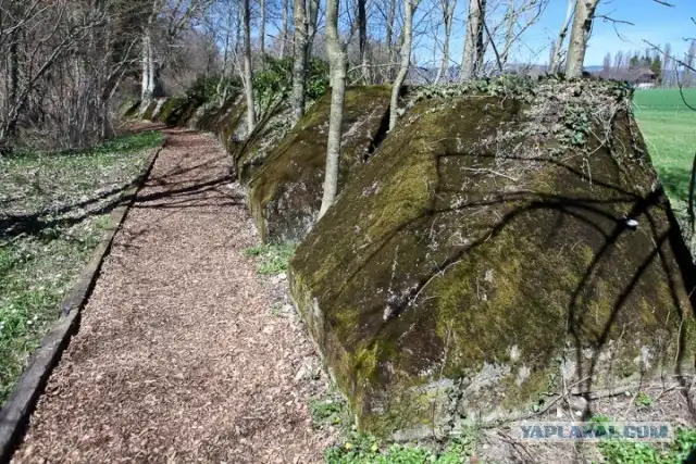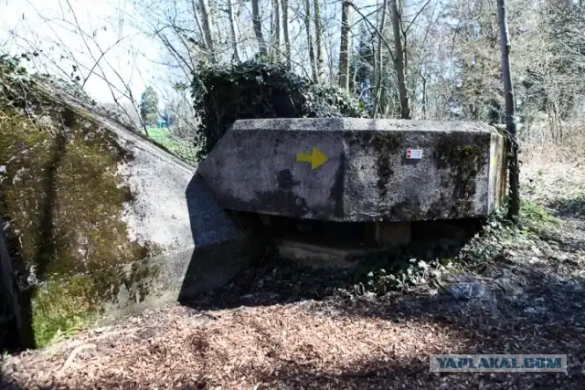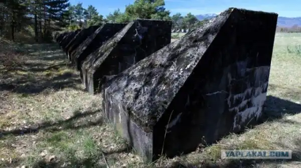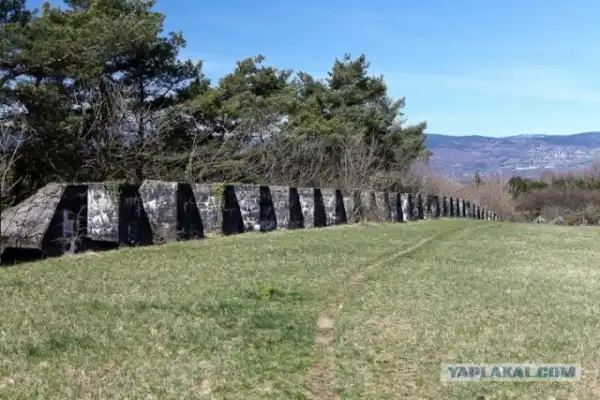Всего в ней около 2700 бетонных блоков, каждый весом девять тонн. Сторона, повернутая в сторону атаки, срублена под углом, чтобы танк на нее заехал и "повис".