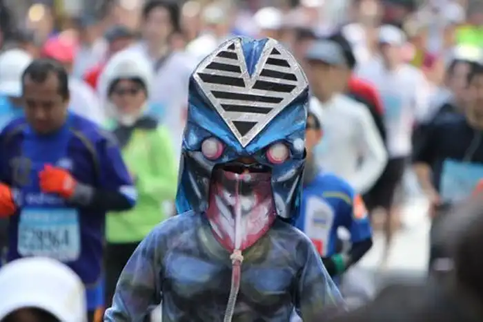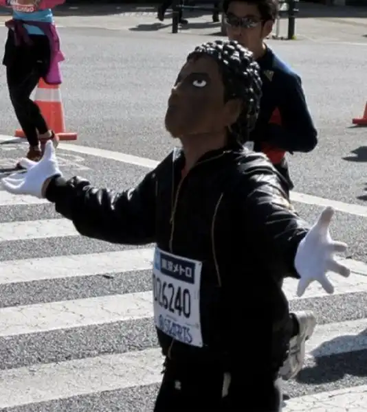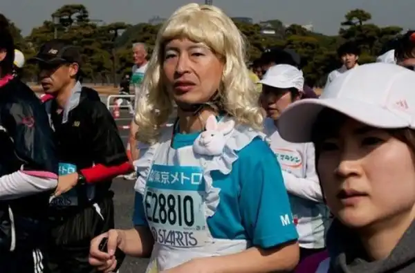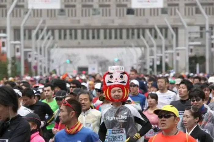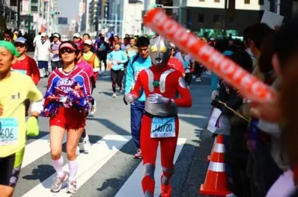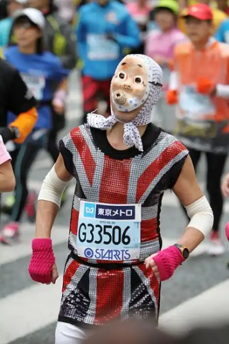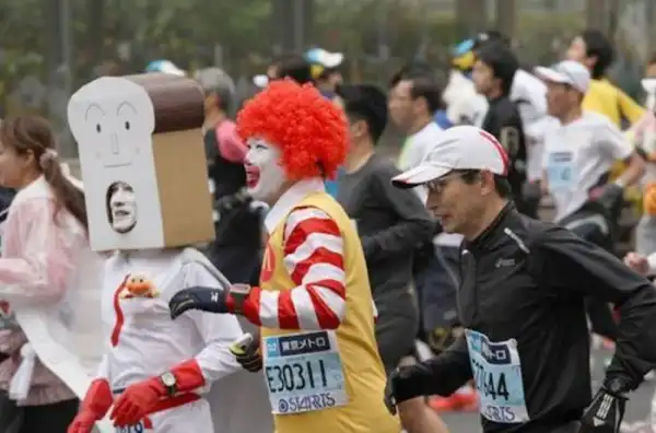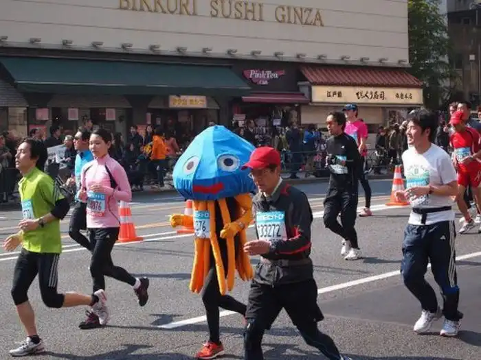 Токийский марафон вполне серьезное спортивное мероприятие, которое собирает сильнейших бегунов со всей планеты. Но это не мешает японцам развлекаться на фоне забега. :tongue: