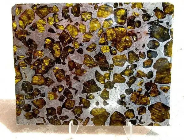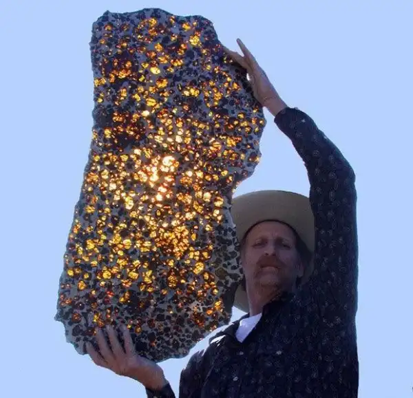 Железный метеорит, с поразительными вкраплениями кристаллов оливина, весит 2,211 кг. Такие вкрапления отмечаются всего в 1% из всех находимых метеоритов на поверхности Земли.