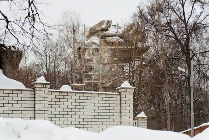 советского скульптора Вучетича, и из-за забора торчат две громадные железобетонные головы.