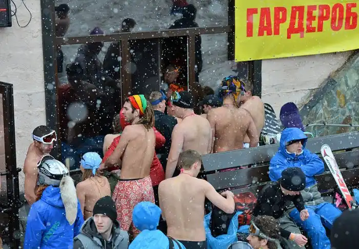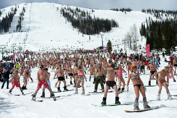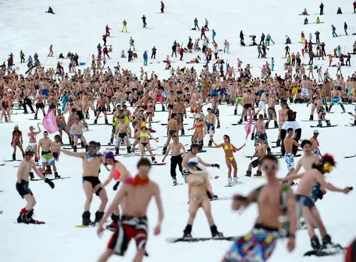 На днях весьма необычная акция среди любителей горнолыжного спорта состоялась в Канаде, где с самого высокого склона горы одновременно вниз спустилось более 500 лыжников, из одежды на которых были лишь купальные костюмы и плавки ;) Смотрим далее на фотографии сотен полуголых сноубордистов и лыжников, которые таким образом решили побить рекорд Гиннеса, во время установления которого с горы в купальниках спустилось всего 250 человек в прошлом году.