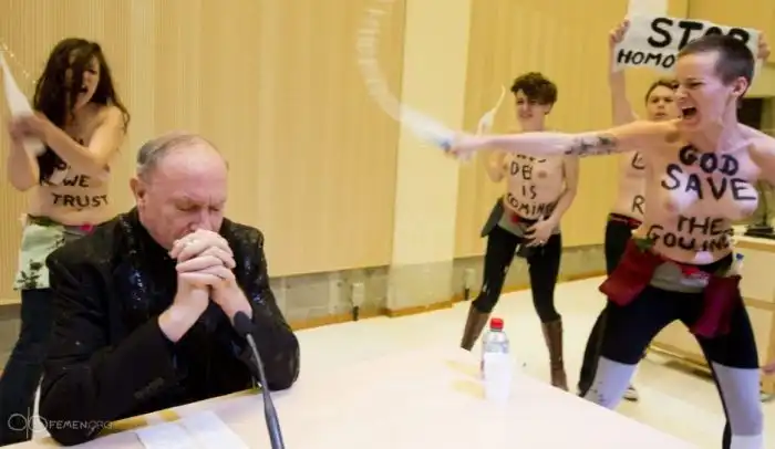 Скандальные девушки из Femen продолжают жечь. На этот раз они атаковали католического священника Андре-Жозеф Леонарда во время чтения лекции о богохульстве. Полуголые дамочки ворвались в один из лекционных залов Свободного университета Брюсселя (ULB) с плакатами "Остановите гомофобию" и еще более радикальными лозунгами на теле, и облили архиепископа водой из пластиковых бутылок. После чего охрана выставила их из зала. Стоит отметить, что 72-летний священник известен своими довольно резкими высказываниями относительно гомосексуальности и сексуальных-меньшинств, именно поэтому он и попал под раздачу Femen'а.