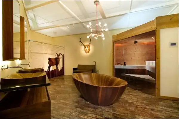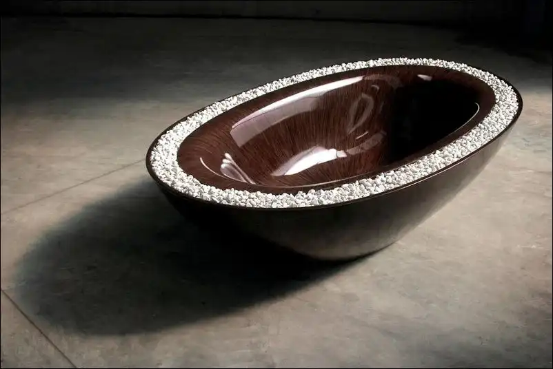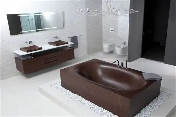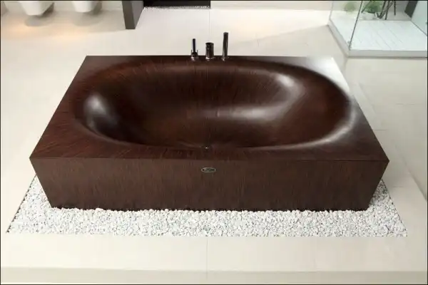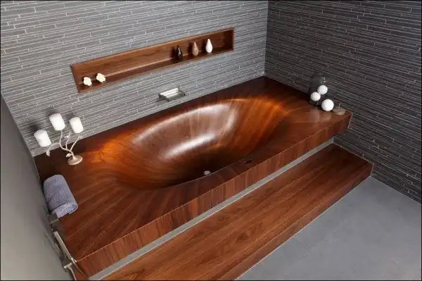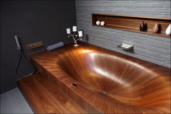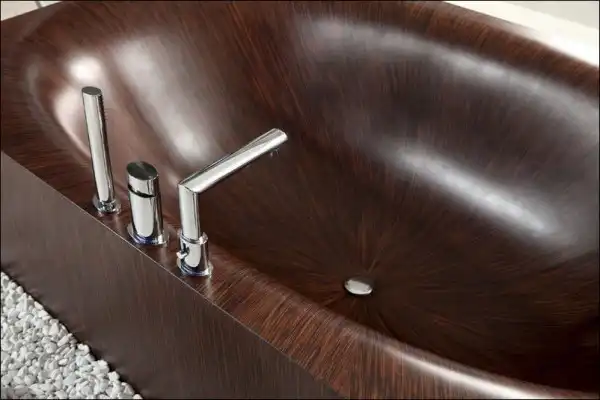 Одна швейцарская компания производит элегантные ванны и раковины, сделанные целиком из дерева. Учитывая многолетний опыт компании в строительстве яхт и умение правильно работать с высококачественной древесиной, ванны получаются отменные. Вес одной ванны составляет порядка 60-80 кг, срок службы 40-60 лет.