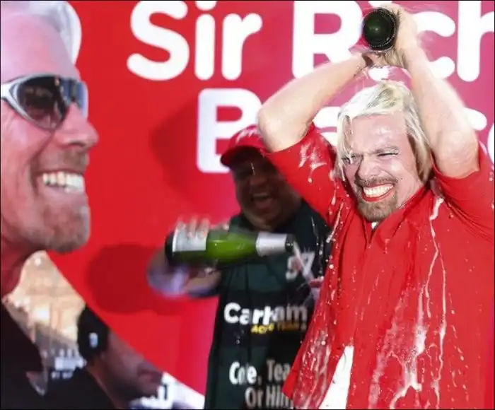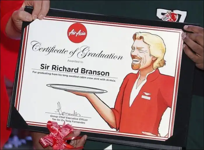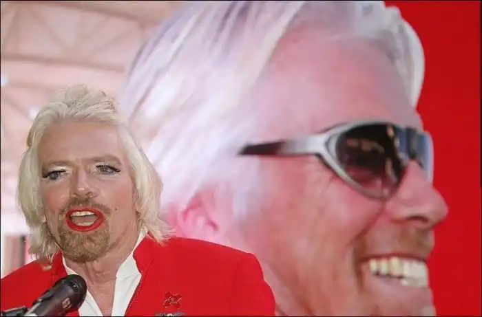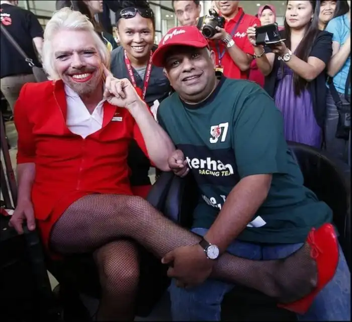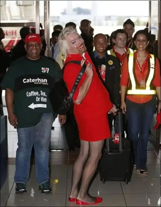 Знакомьтесь, этого мужчину зовут Ричард Брэнсон, и он является основателем авиакомпании Virgin. На днях этот миллиардер проиграл пари со своим другом, который является директором авиакомпании AirAsia, а условием спора было то, что проигравший участник пари должен будет на один полет стать стюардессой на авиарейсе Перт — Куала-Лумпур :) Конечно же, Брэнсон, как человек слова, выполнил условие спора. Он побрил ноги, надел униформу и выполнял все функции стюардессы во время полета ;) Кстати, спорили они по поводу результатов заезда Формулы-1.