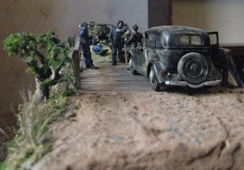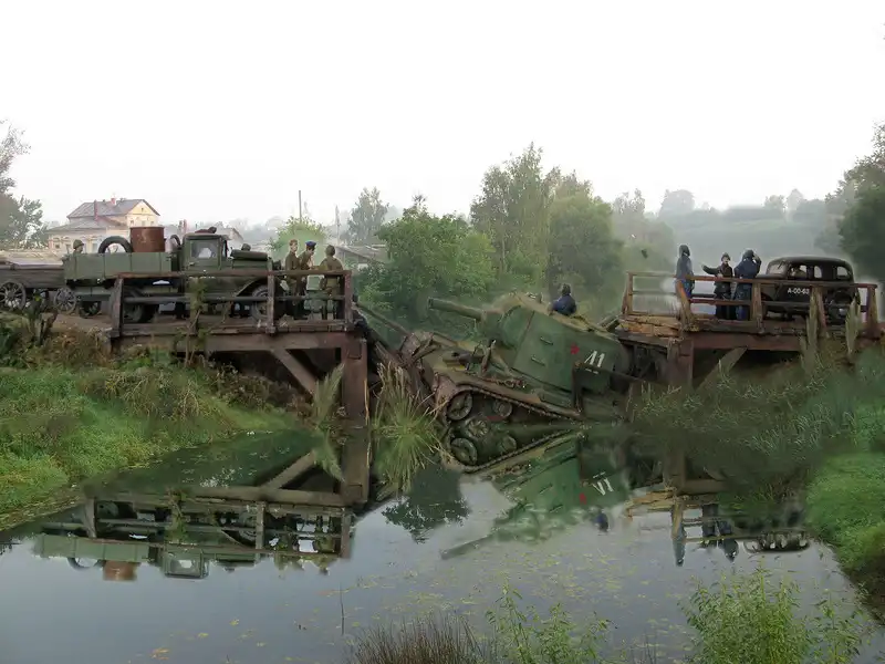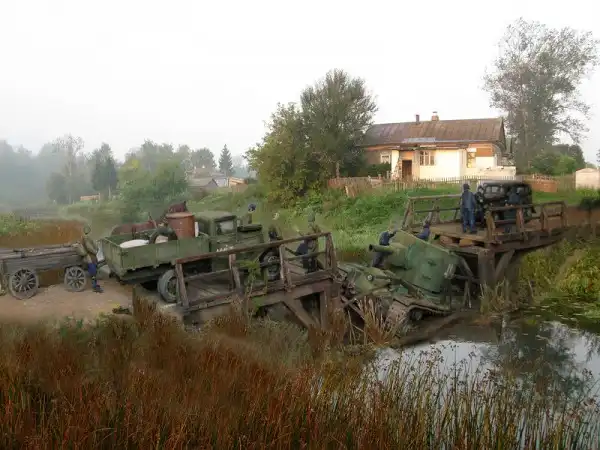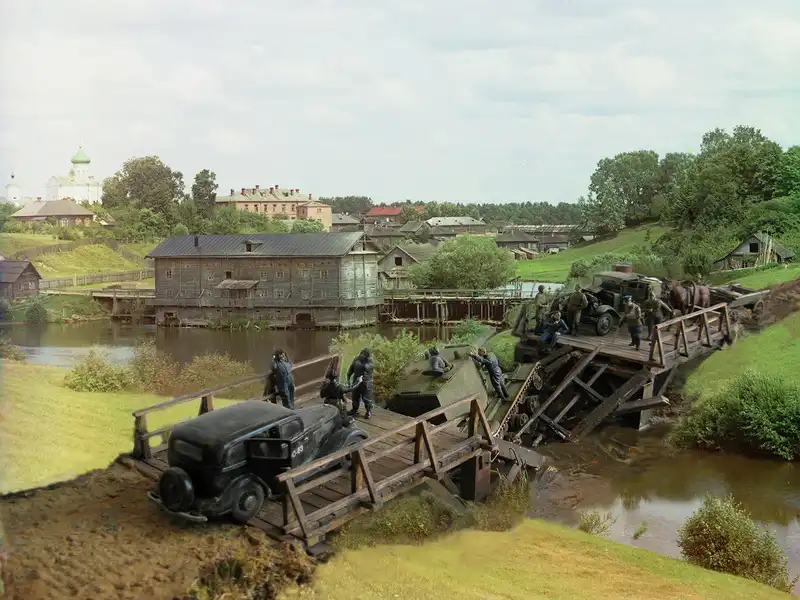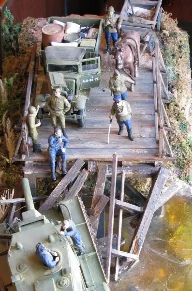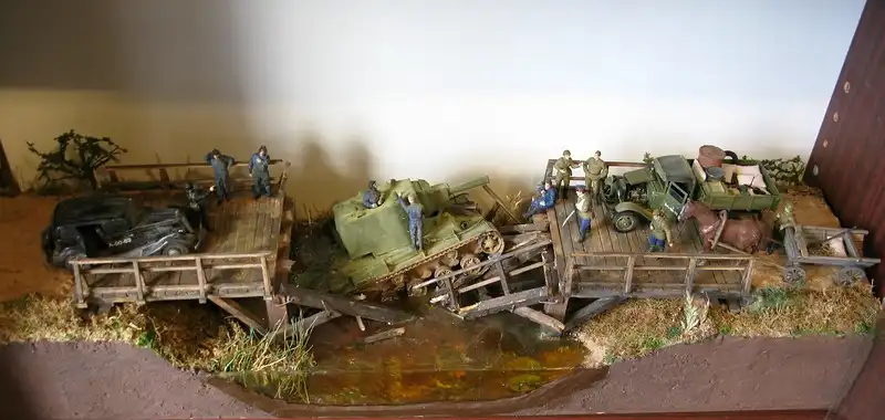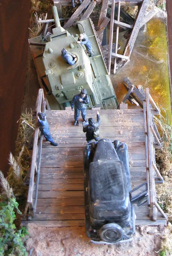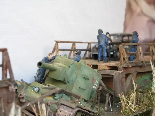 Это очень трагическая и вместе с тем героическая история о том, как летом 1941 года советский тяжёлый штурмовой танк КВ-2 (самый мощный в мир на тот момент) обрушил деревянный мост и увяз в реке, вблизи оставленного Красной Армией городка. Молодой отчаянный лейтенант сумел собрать новый экипаж и вытянуть с помощью местных жителей на берег 52-тонную махину, чтобы принять на ней последний бой. Диорама имеет всё же свой, самостоятельный сюжет: