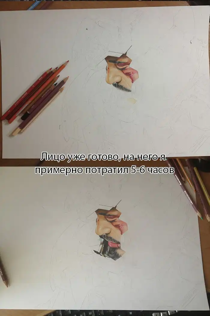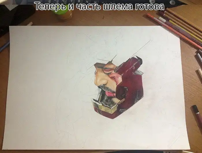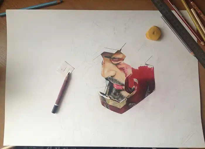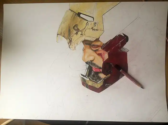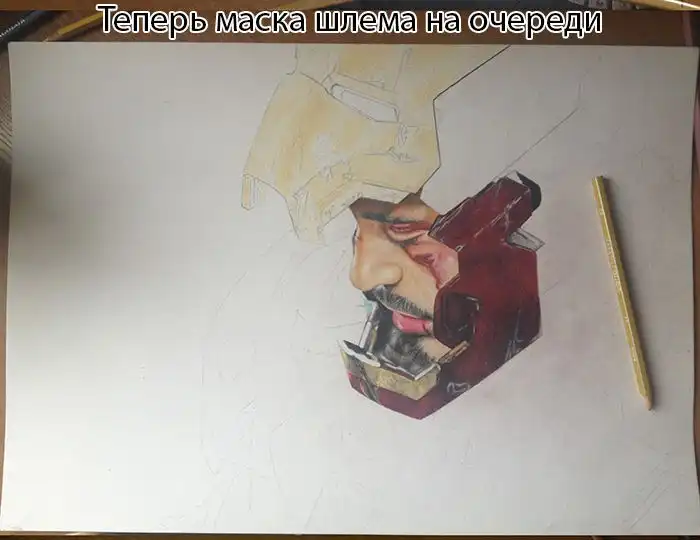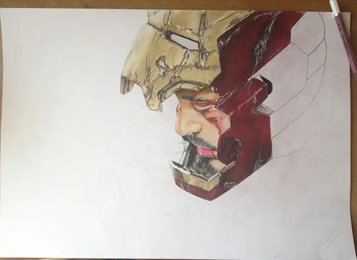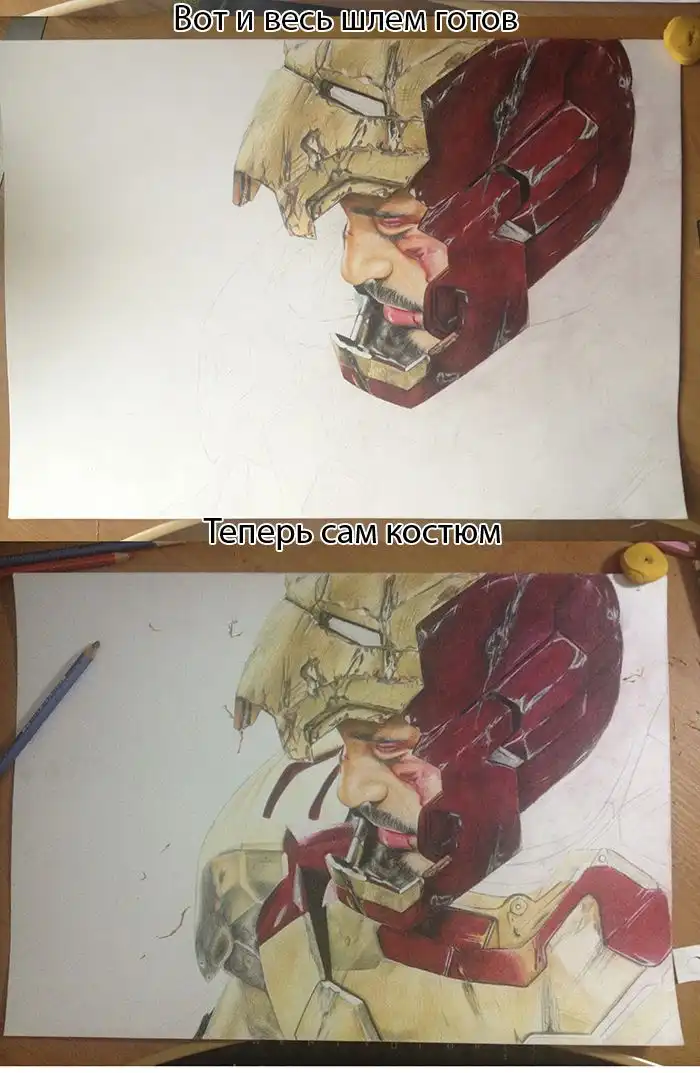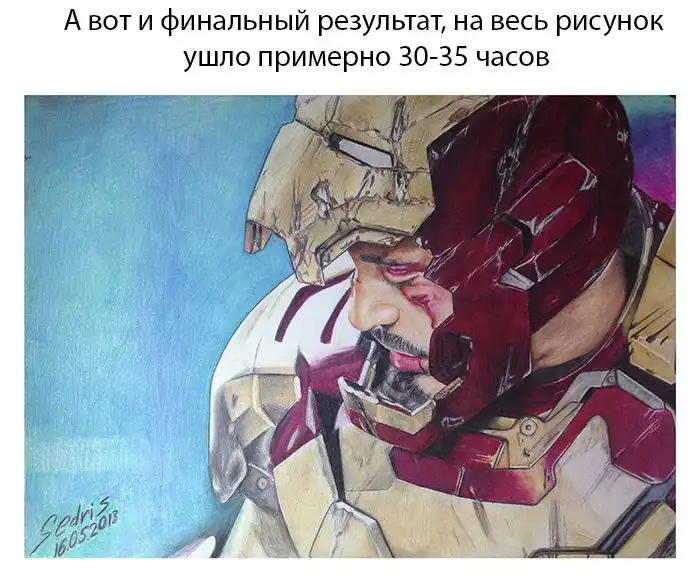 Сегодня я хочу показать вам удивительный рисунок главного персонажа из фильма "Железный человек", который был сделан при помощи обычных цветных карандашей, а на его создание ушло почти 35 часов.