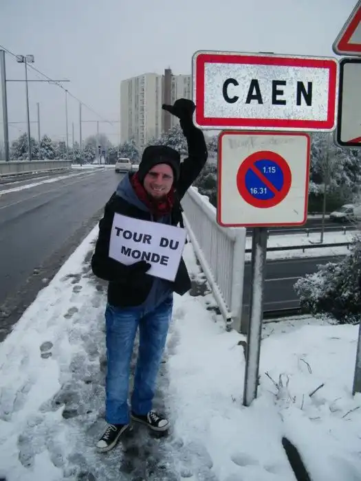 В октябре 2007 года 29-летний путешественник стартовал из города Кан (Caen), Нормандия, передвигаясь на попутных автомобилях, лодках, самолетах и даже ослах.