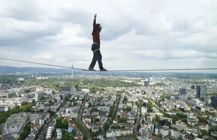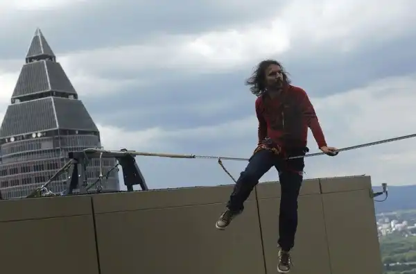 Рейнхард, используя только руки для балансирования, прошел дважды по 30-метровому полиэфирному канату, закрепленному за два крыла П-образного городского небоскреба на 185 метров выше сотен ликующих сторонников. Это представление происходило в немецком городе Франкфурт во время фестиваля небоскребов, который начался 25 апреля.