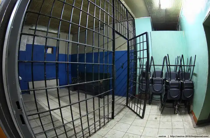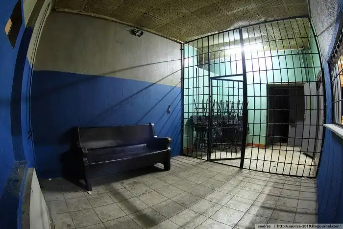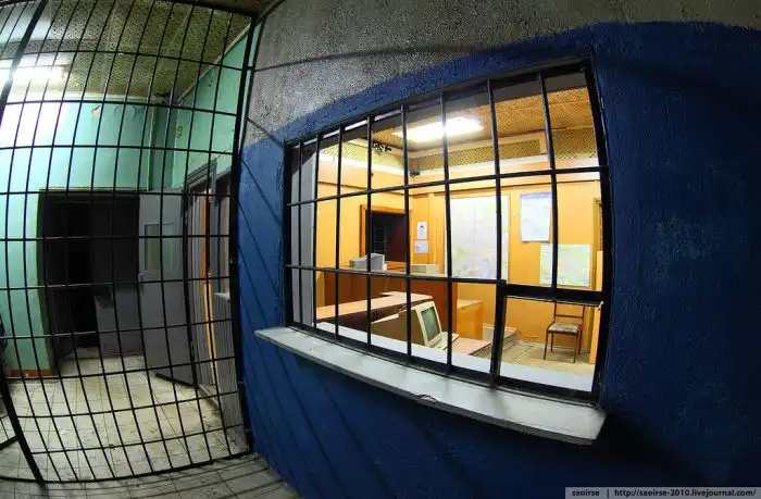 Залезть в камеру предварительного заключения (в народе - обезьянник) оказалось не так просто. Убедившись, что все двери закрыты в здании, пришлось лезть в маленькое окно, что под потолком в камере. На фотографии видна эта форточка.