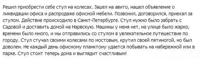 Один парень рассказал увлекательную историю о том, как он, купив стул, отправился с ним гулять по Питеру.