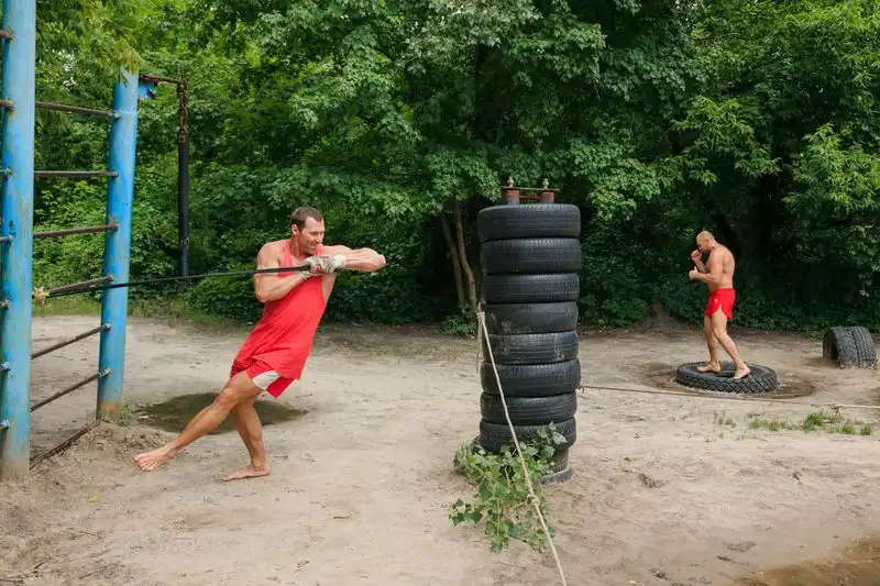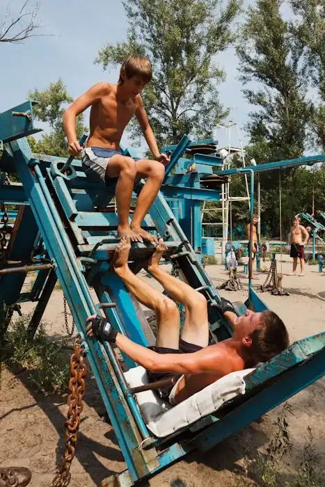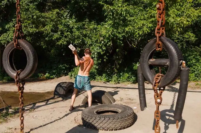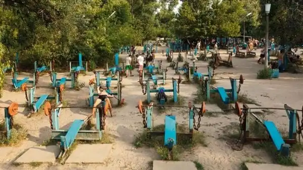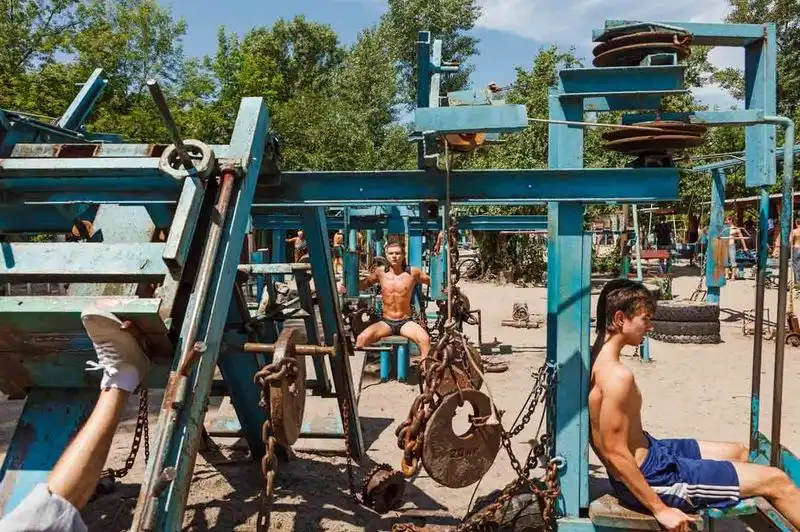 В огромном парке на берегу Днепра можно найти тренажеры для всех групп мышц. Изготовлены они из металлолома, автомобильных запчастей, строительных блоков, деревянных досок и другого хлама.