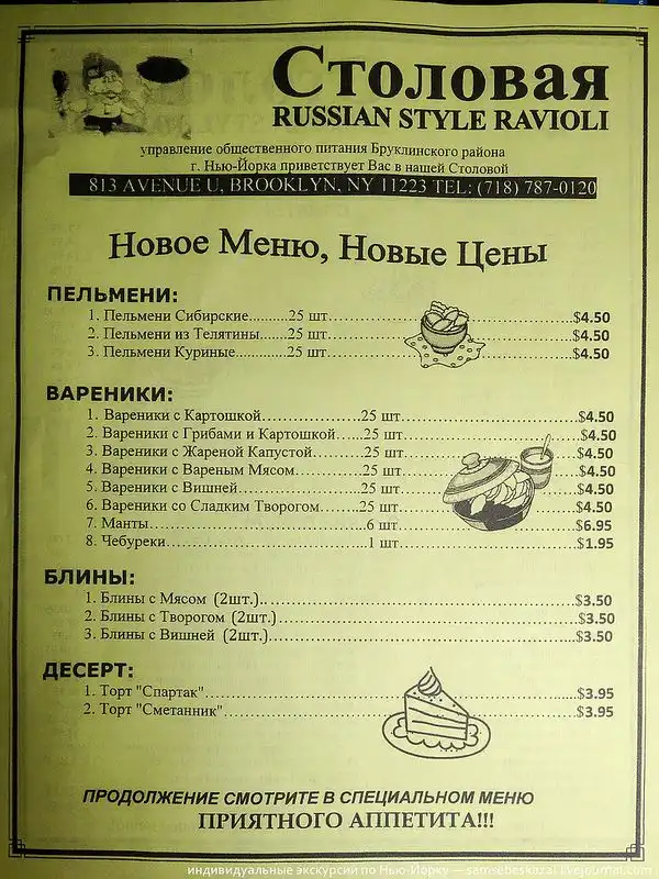 Обычно я покупаю у них мороженные пельмени на вынос. Пачка из 50-ти штук стоит 5 долларов. Пельмени как домашние. Магазинные после них я есть не могу. Так как там оживленная улица и проблемы с парковкой, то я звоню по телефону на вывеске и прошу вынести их к машине. Всегда выносят без проблем.