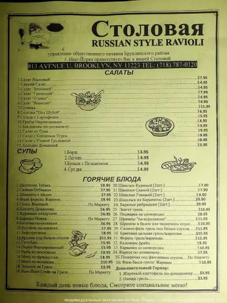 В понедельник ребенок закончил школы и мы решили это дело как-то отпраздновать. Сын потребовал отвести его в ресторан и накормить супом. На самом деле, эта с виду невинная просьба не так легко выполнима. Мы не очень большие ходоки по ресторанам, а в половине заведений, что знаем, супы в принципе не подают, или подают один-два и совсем невкусных. В американских заведениях они еще и весьма своеобразны. Но обрадовавшись, что ребенок просит не картошку фри с нагетсами, а нормальную еду мы выдвинулись на поиски. В итоге выбор пал на заведение под названием "Столовая" в Бруклине. Там довольно своеобразная атмосфера, но дешево и главное довольно вкусно. А еще это не Брайтон, что тоже добавляет этому месту очков.