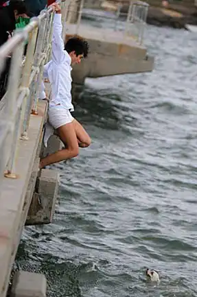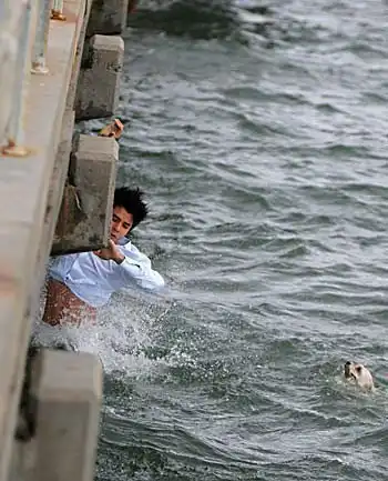 Было довольно прохладно, когда люди заметили барахтающуюся в воде собачку, видимо, упала и выбраться самостоятельно у неё не было возможности. И тут ей на выручку пришел обычный парень - настоящий герой! Я уверен, так же без раздумий он бы кинулся спасать и человека!