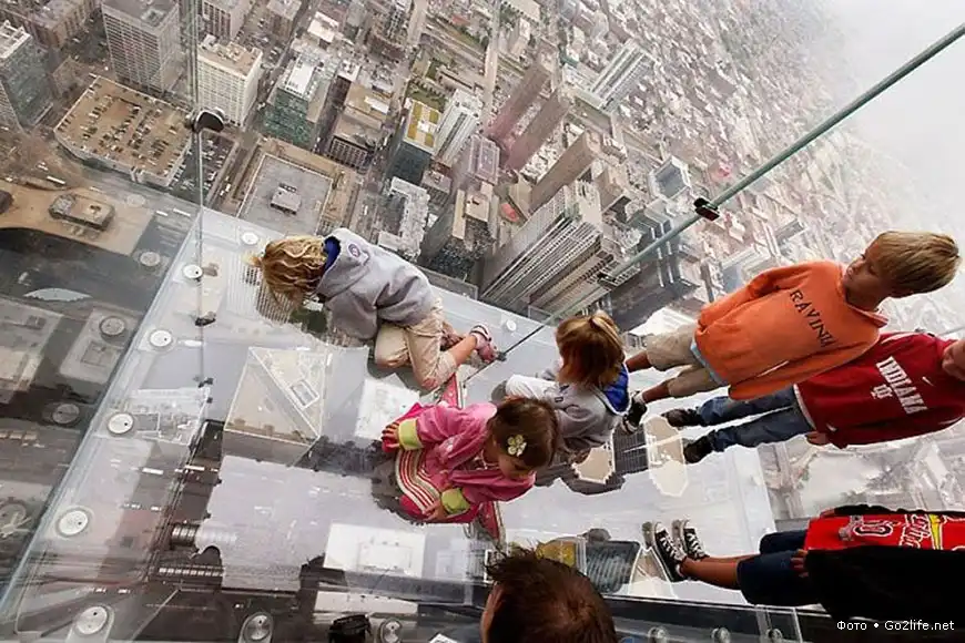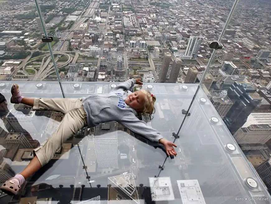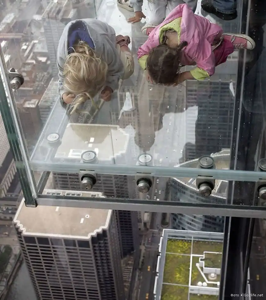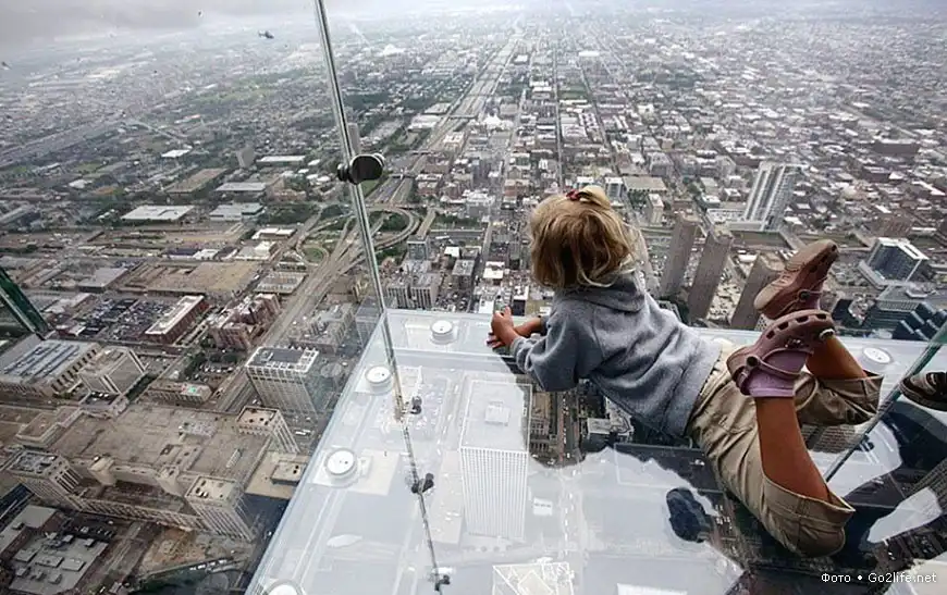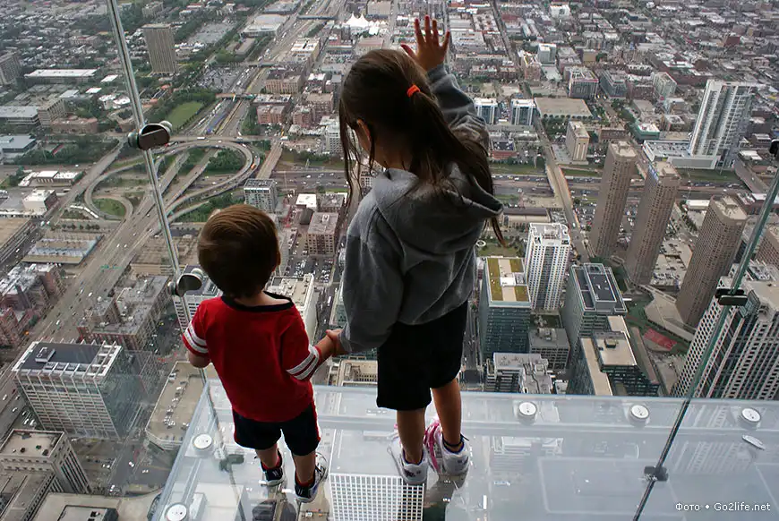 Небоскрёб Sears Tower (Уиллис-тауэр, 110 этажей, высота – 443,2 м), находящийся в Чикаго, самое высокое здание в США и пятое по высоте в мире. На 103-м этаже этого небоскрёба были прочно установлены четыре стеклянных балкона (Sears Tower skydeck), выступающих из здания на некоторое расстояние. Каждый такой балкон способен выдержать нагрузку в целых 5 тонн, а толщина массивного стекла составляет почти 4 сантиметра. Каждый посетитель этой экстремальной площадки, своего рода аттракциона, должен заплатить $15, но несмотря на это каждый родитель с удовольствием приводит туда своего ребенка, потому что дети от такого наблюдения с огромной высоты родного города просто в изумлении.