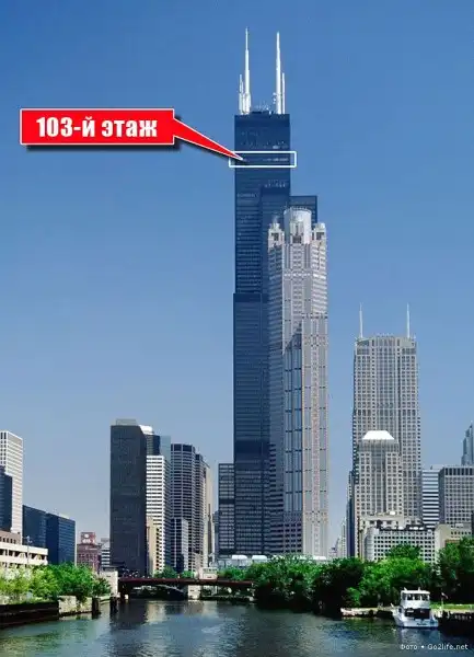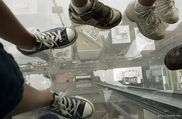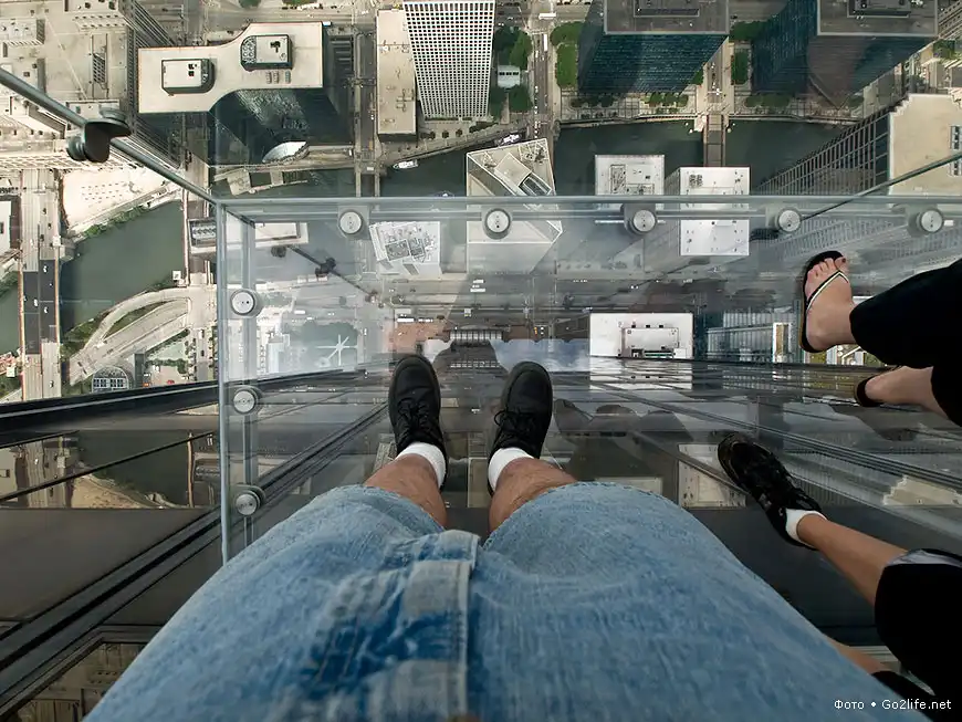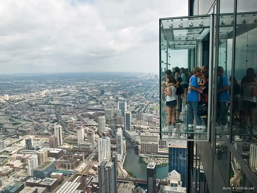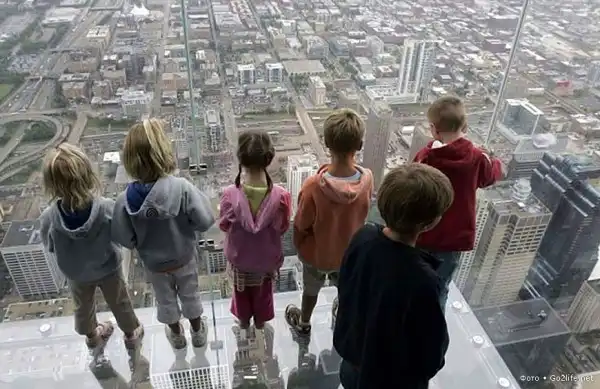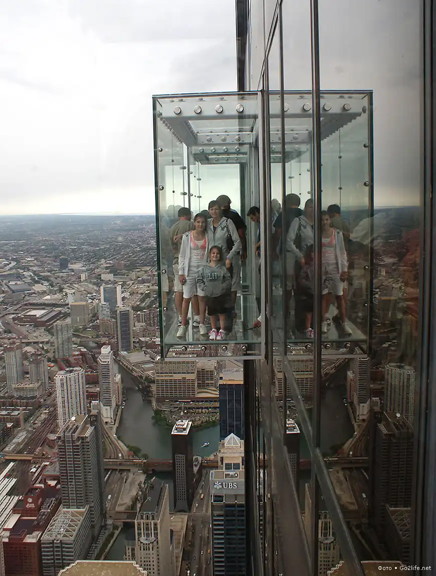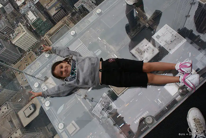 Небоскрёб Sears Tower (Уиллис-тауэр, 110 этажей, высота – 443,2 м), находящийся в Чикаго, самое высокое здание в США и пятое по высоте в мире. На 103-м этаже этого небоскрёба были прочно установлены четыре стеклянных балкона (Sears Tower skydeck), выступающих из здания на некоторое расстояние. Каждый такой балкон способен выдержать нагрузку в целых 5 тонн, а толщина массивного стекла составляет почти 4 сантиметра. Каждый посетитель этой экстремальной площадки, своего рода аттракциона, должен заплатить $15, но несмотря на это каждый родитель с удовольствием приводит туда своего ребенка, потому что дети от такого наблюдения с огромной высоты родного города просто в изумлении.