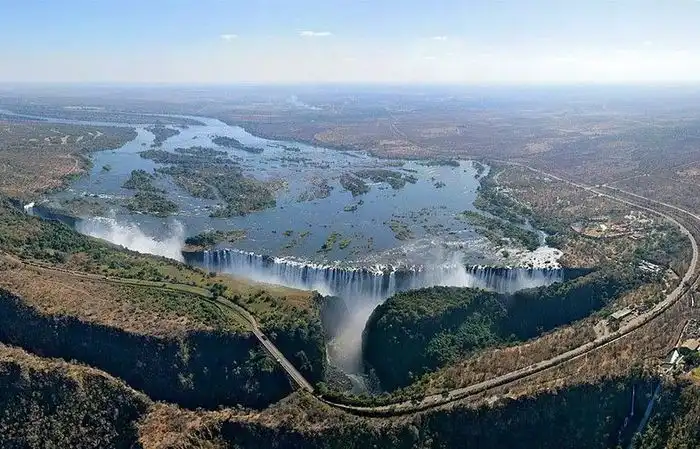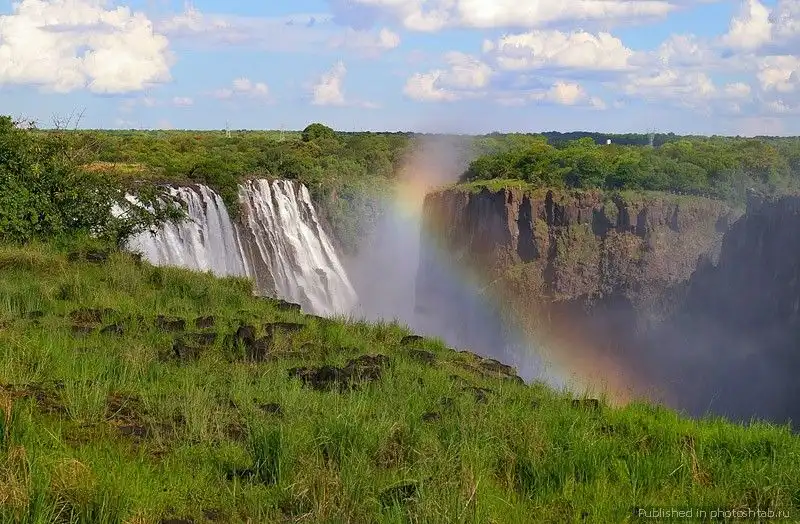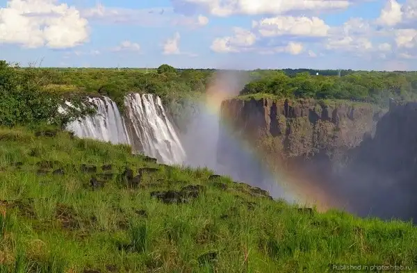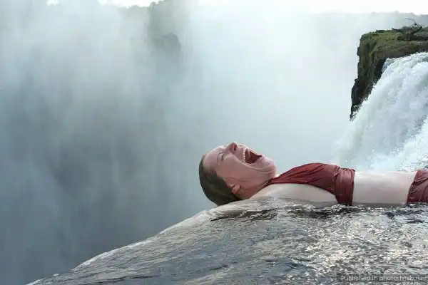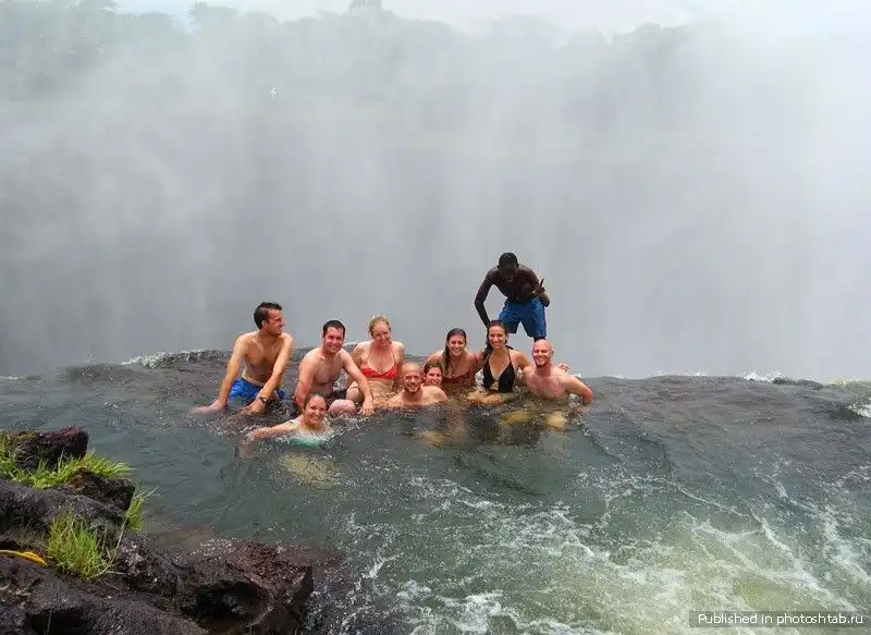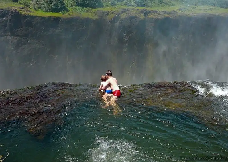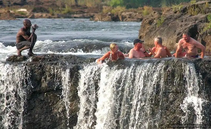 Одним из самых величественных водопадов Земли является водопад Виктория. С высоты 128 метров, тонны воды низвергаются в узкое ущелье. А перед самой пропастью вода, вымыла в скалистом дне настоящий природный бассейн. Кому посчастливилось здесь купаться, никогда не забудут это место.