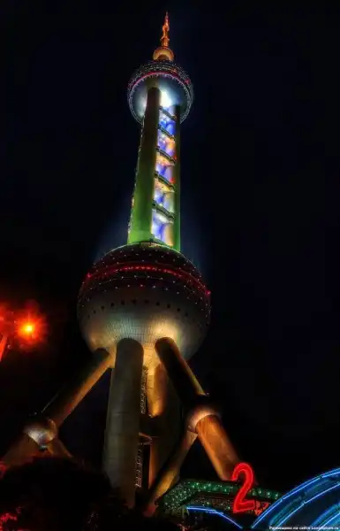 «Восточная жемчужина» — вторая по высоте телебашня в Азии. Сфера наверху башни имеет диаметр 45 метров и находится на высоте 263 метра над землей.
