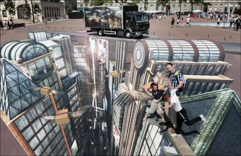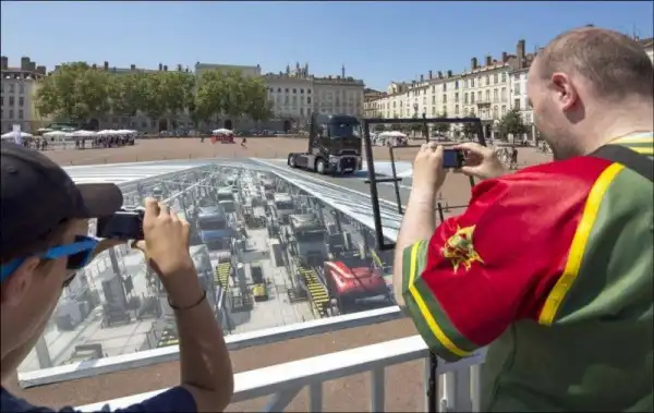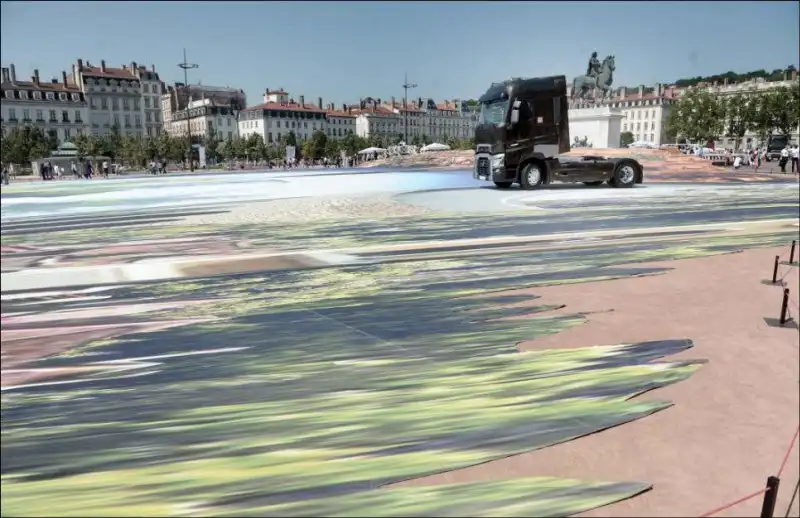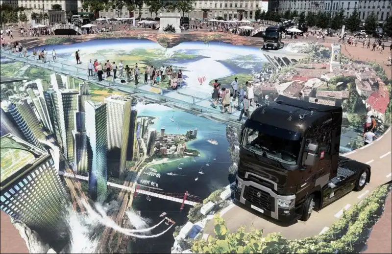Художник Франсуа Абелане создал удивительный 3D стрит-арт для мероприятия, посвященного новой линейке грузовиков Рено в Лионе.