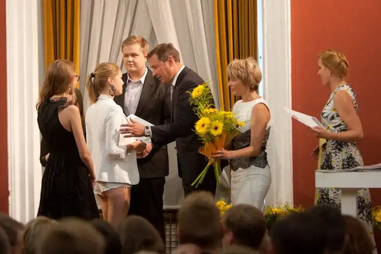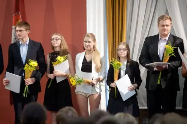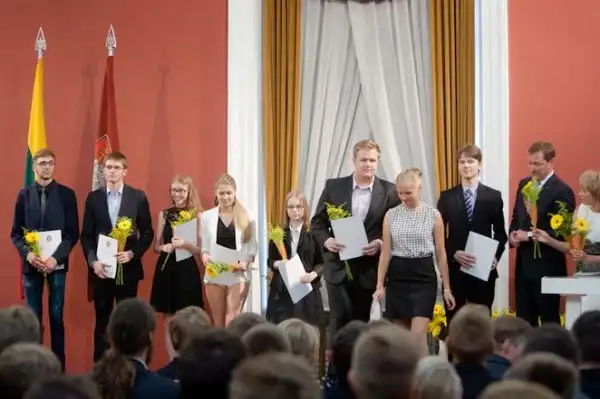 15 июля в ратуше Вильнюса собрались самые лучшие школьники города, где их поздравил мэр. Девушка на фото набрала высший бал на четырех государственных экзаменах. Сломала шаблон она тем, что во все места поимела школьный дресс-код. Мораль: умная девушка - не значит, что скромная.