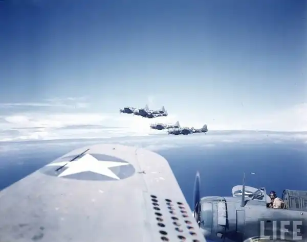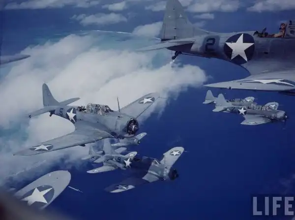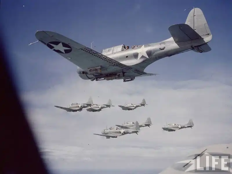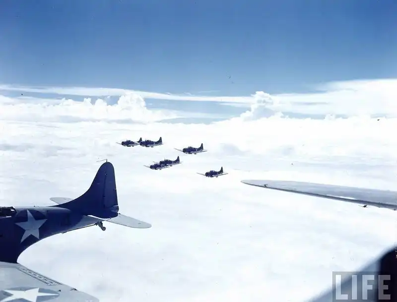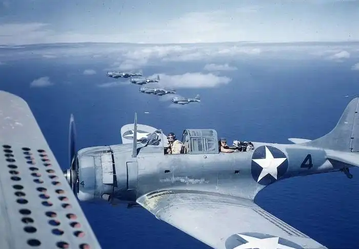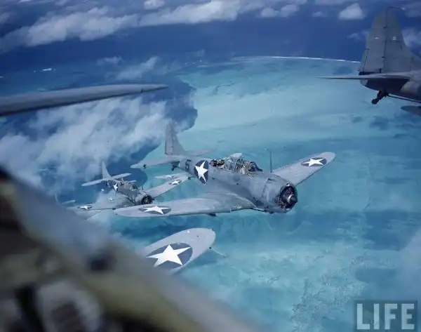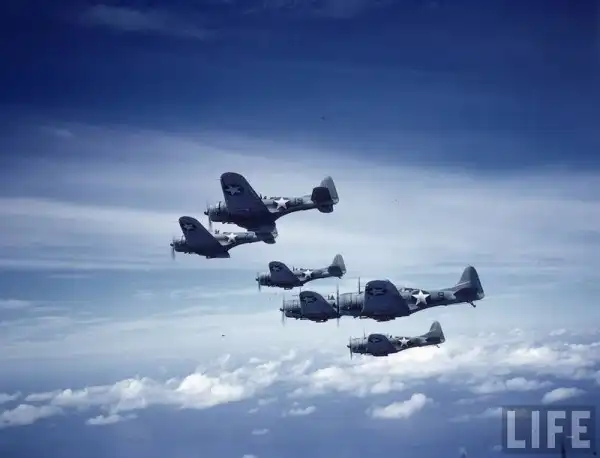 Это фотографии эскадрильи SBD «Даунтлесс» в полете. SBD Dauntless — американский палубный пикирующий бомбардировщик — разведчик. Считается наиболее удачным палубным пикирующим бомбардировщиком американских ВМС в годы второй мировой войны.