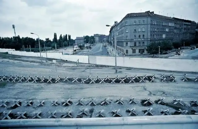 На этом фото 1981 года можно увидеть отрезок «смертельной полосы» между внешней и внутренней частями Берлинской стены. На отрезке используются караулы, прожекторы, ежи и более 100 км электрической проволоки для изоляции Восточного Берлина от западного.
