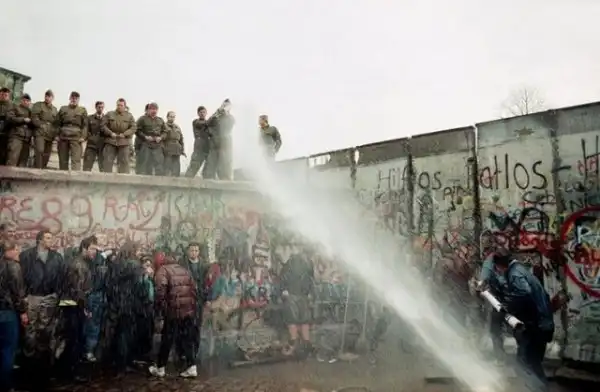 Совершенно другая сцена на Берлинской стене 9 ноября 1989 года, когда правительство Восточной Германии объявило после нескольких недель восстаний, что все граждане ГДР могут посещать Западную Германию и Западный Берлин. Толпа празднует падение Берлинской стены.