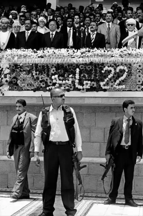 Президент Йемена Али Абдала Салех вместе с другими высокопоставленными лицами присутствует на торжественном мероприятии по случаю воссоединения страны. Внизу на переднем плане видим трех сотрудников охраны, обеспечивающих личную безопасность данных лиц.