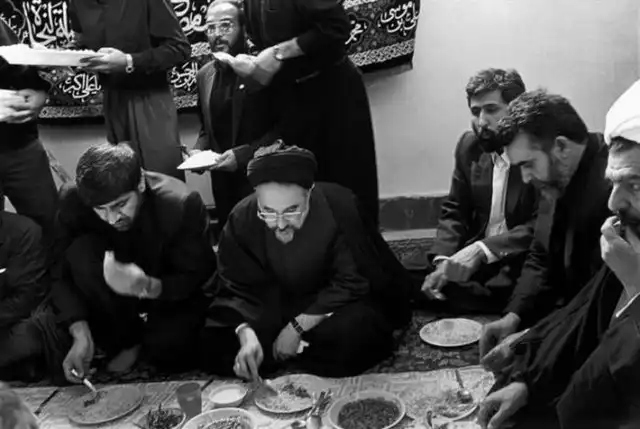 Иран, город Керман, 1997 год. Кандидат в президенты Ирана Мохаммад Хатами (справа и слева рядом с Хатами сидят его телохранители) обедает вместе со своими сотрудниками личной охраны и помощниками