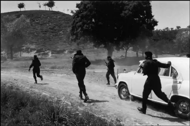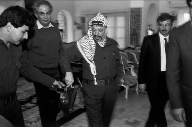 Тунис, 1988 год. Ясир Арафат передает свой пистолет-пулемет телохранителю.