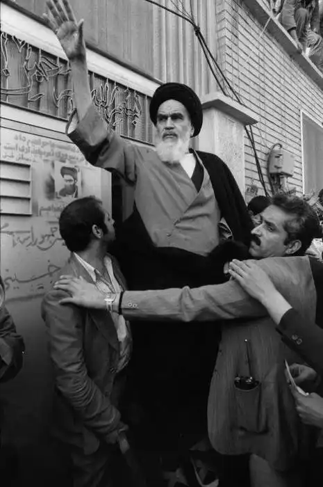 Иран, город Кум, 1979 год. Аятолла Хомейни Рухолла (высший руководитель Ирана с 1979 по 1989 гг.) приветствует сторонников у подъезда собственного дома. Рядом с Хомейни находятся его телохранители