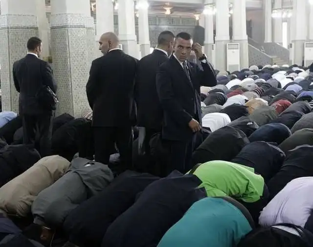 Телохранители президента Египта Мухаммеда Мурси стоят на страже во время молитвы в главной мечети Рима.