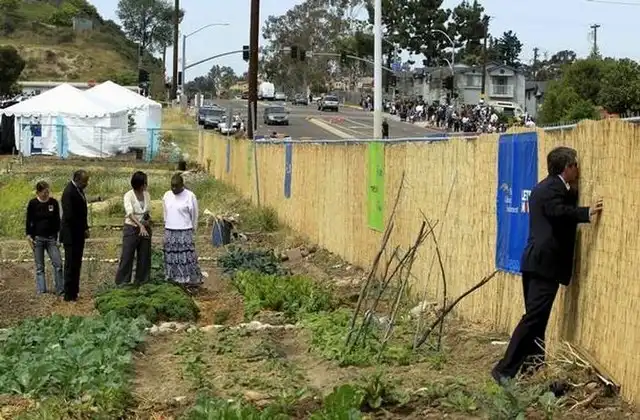 Агент Секретной службы осматривает территорию за забором во время обеспечения личной безопасности первой леди США Мишель Обамы, ферма в Сан Диего, Калифорния.
