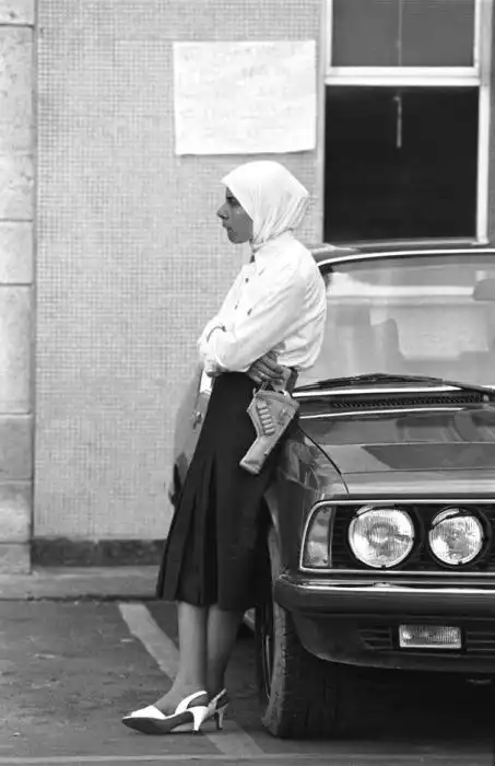 Женщина-телохранитель находится возле автомобиля Каддафи с оружием в кобуре. Аддис-Абеба, Эфиопия, 6 июня 1983 год.