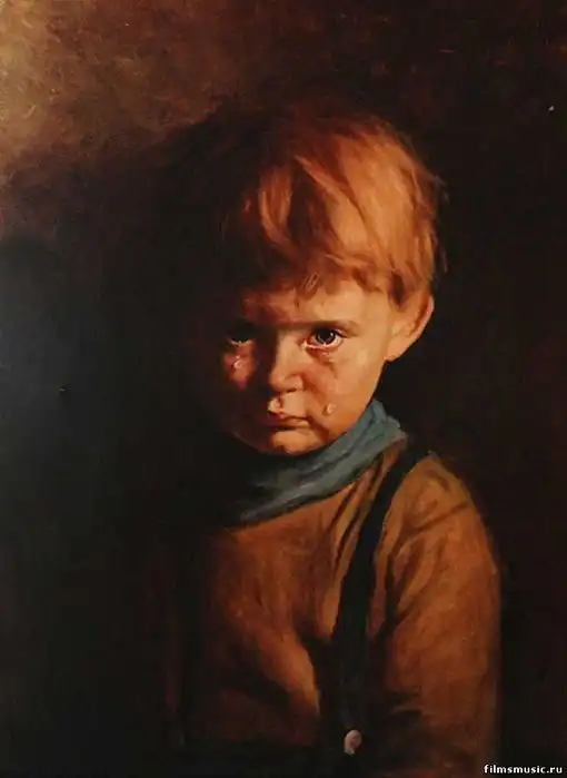 Художник и автор картины "Плачущий мальчик",отец изображённого на ней ребёнка,издевался над сыном,зажигая перед лицом малыша спички. Дело в том,что мальчик до смерти боялся огня. А мужчина таким образом старался до6иться яркости,жизненности и естественности полотна. Мальчик плакал - художник рисовал. Однажды малыш закричал на отца: " Гори ты сам ! ". Через месяц ребёнок умер от пневмонии. А ещё через пару недель обугленное тело художника было найдено в его же доме рядом с уцелевшей в пожаре картиной плачущего мальчика.