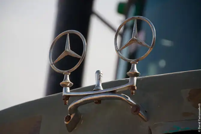 На центральной площади шла перегрузка старого грузовика Мерседес, на котором обнаружилась двойная эмблема.